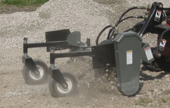 Elevating productivity, the 10-Series Power Rakes for Mini / Compact Skid Steers features a #80 chain drive, flip-up side shields, dual gauge wheels, adjustable material bar and optional hydraulic angle.