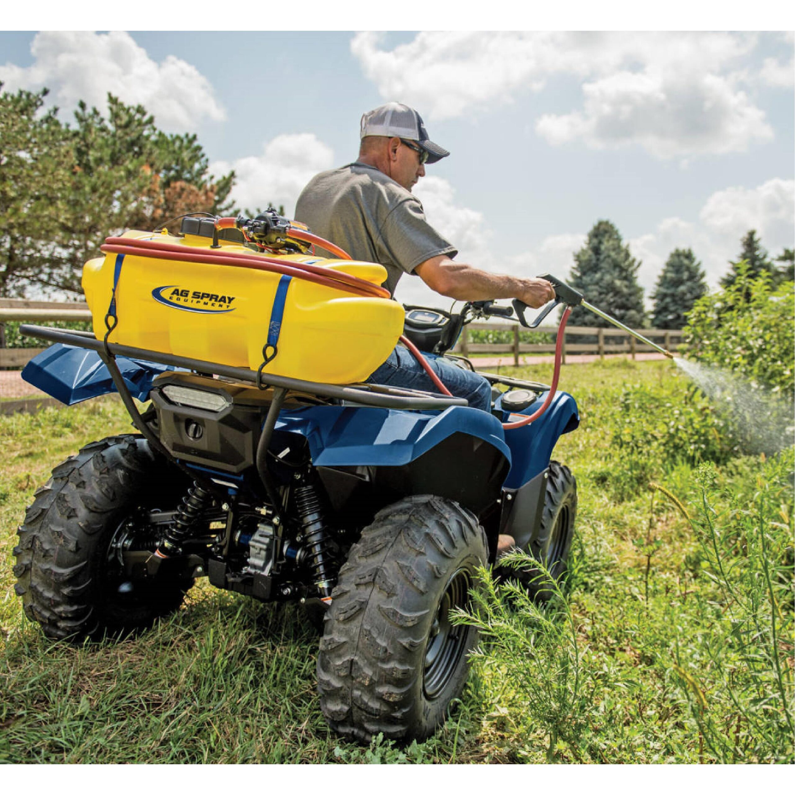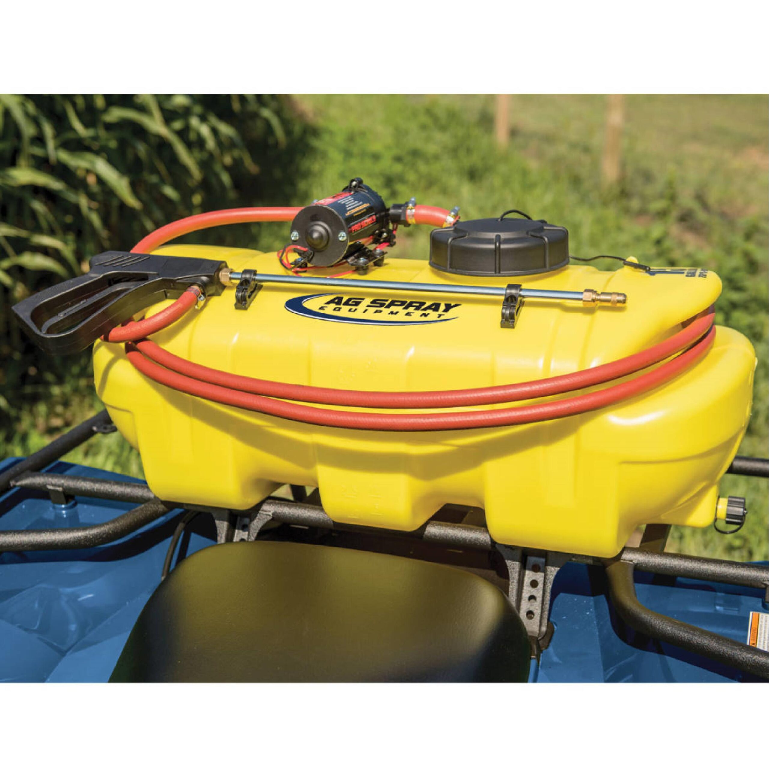 The 15 GALLON BRUSHBUSTER SPRAYER is designed for weed and pest control. This spot sprayer can be placed on the rack of an ATV, and in the back of a UTV or pickup truck. The High-Flo Series 12 Volt Pump is rated up to 2.2 GPM and 100 PSI. The UV resistant, molded polymer tank has a 5-inch tethered lid for easy access and is completely drainable for quick and effective clean out after spraying. The Deluxe Pistol Grip Spray Wand with an adjustable spray pattern brass tip can quickly adapt from straight stream to a cone pattern to meet your application needs and distributes up to 35 feet of horizontal spray, 26 feet of vertical spray with heavy duty hose that is both diesel and chemical compatible. The 15-gallon lawn and garden sprayer allows accurate and easy application of lawn care products with the versatility and efficiency needed to spray tight areas, around buildings, fence lines, trees, bushes or other obstacles. This spot sprayer is designed for controlling weeds, insects and diseases on lawns, an acreage, food plots, ditches, fence lines and small pastures.