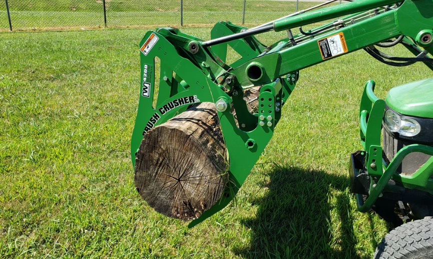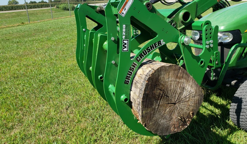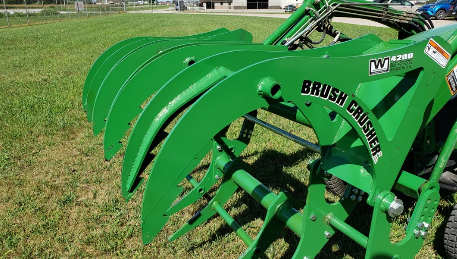 Brush Crusher™The new patented BC-4200 brush handling attachment makes those painful labor intensive tasks like clearing trees, handling brush, or even cleaning up after a storm–Fun! The BC-4200 model is a mid-sized model of the Brush Crusher™ family. It’s adjustable so you can get the tooth action that you need. It is designed to fit on the John Deere coupler of several different loaders. Be sure to request the additional teeth for some extra grabbing power, or just ask for the “4215”.