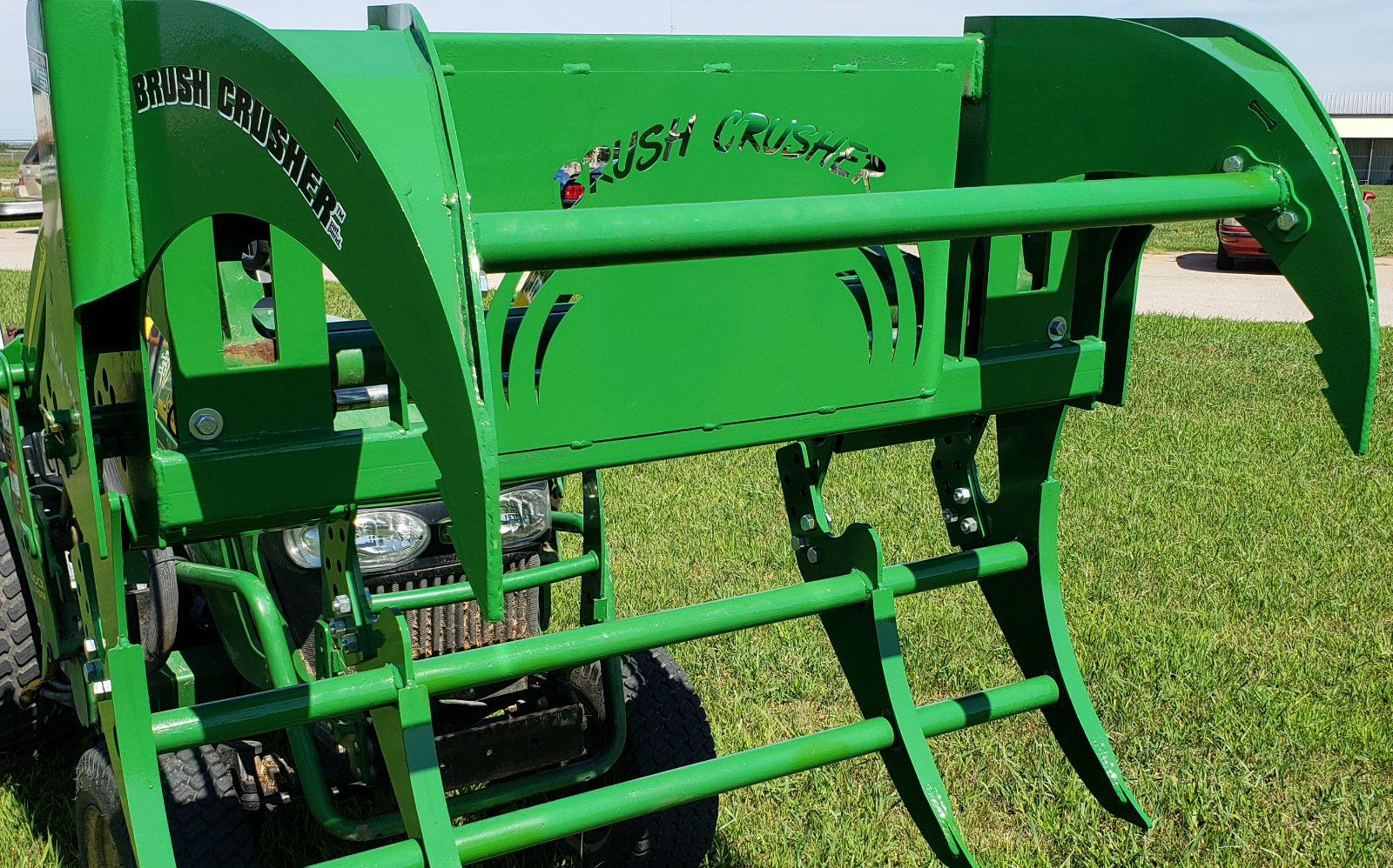 The new patented BC-4255 brush handling attachment makes those painful labor intensive tasks like clearing trees, handling brush, or even cleaning up after a storm–Fun! The BC-4255 is adjustable so you can get the tooth action that you need. It is designed to fit on the John Deere coupler of several different loaders.  Be sure to request the additional teeth for some extra grabbing power!