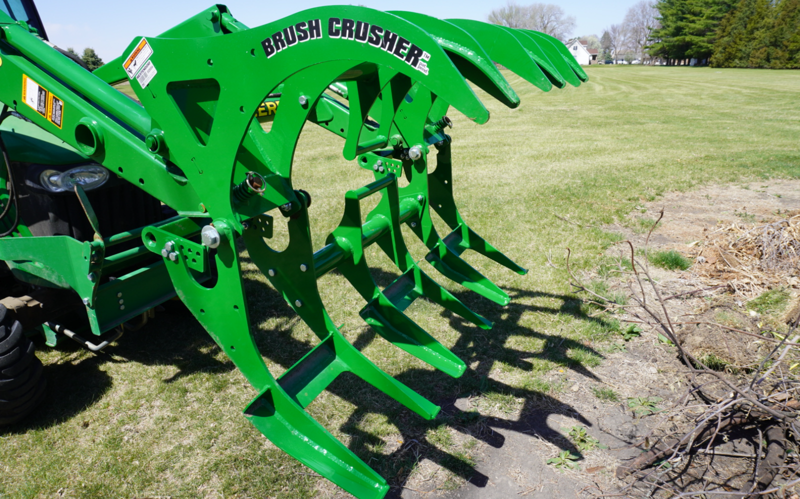 The new patent pending JD Brush Crusher attachment makes those painful labor intensive tasks like clearing trees, handling brush, or even cleaning up after a storm–fun! The new JD model is a mid-sized model of the Brush Crusher™ family, and it’s adjustable so you can get the tooth action that you need. It is designed to fit on ANY loader with a JD style coupler.
