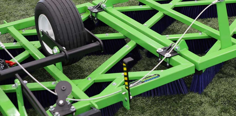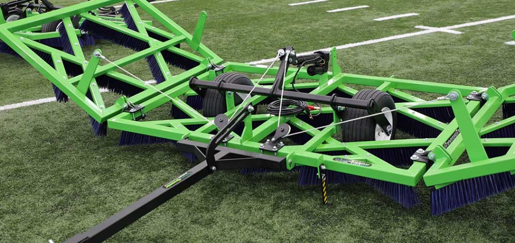 The Wide Format Synthetic Sports Turf Groomer has 24 Super Duty Blue brushes set at various angles to the direction the unit is being towed. It has perfect balance side to side and front to back — allowing for smooth brushing with no hopping. The electric actuator provides almost infinite adjustment control, from wheels down transport to wheels up brushing.